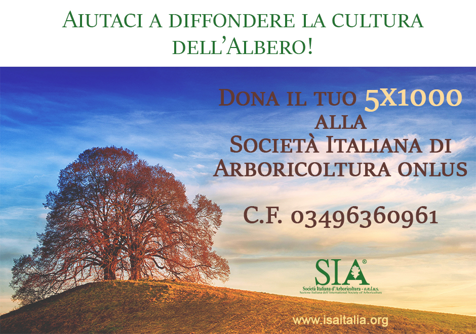 Scegli di destinare il tuo 5x1000 dell’IRPEF alla Società Italiana di Arboricoltura onlus contribuendo a sostenere, anche economicamente, le attività di divulgazione della Cultura dell'albero e delle professionalità in arboricoltura che organizziamo e portiamo avanti.